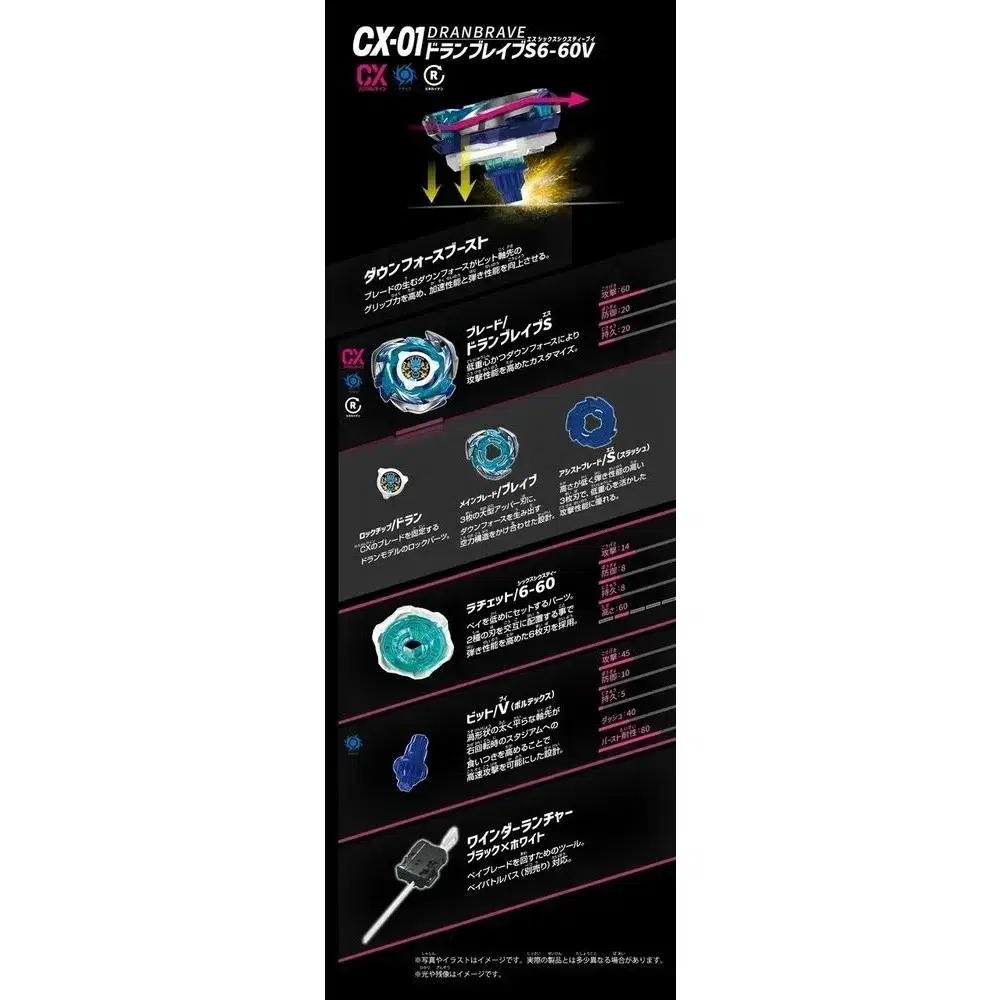 La lame du CX-01 présente un design à trois ailes massives, sculptées pour porter des coups lourds et déstabilisants. Contrairement aux versions précédentes, le Dran Brave concentre son poids sur les points d’impact extérieurs, ce qui décuple la force centrifuge et permet de projeter littéralement les adversaires hors du stadium.